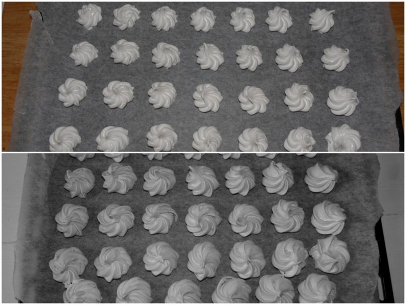 Transférer le mélange dans une poche à douille et créer les meringues sur la plaque de cuisson tapissée de papier sulfurisé en les espaçant un peu entre elles, puis cuire environ 30 minutes dans un four à chaleur tournante préchauffé à 100°C.