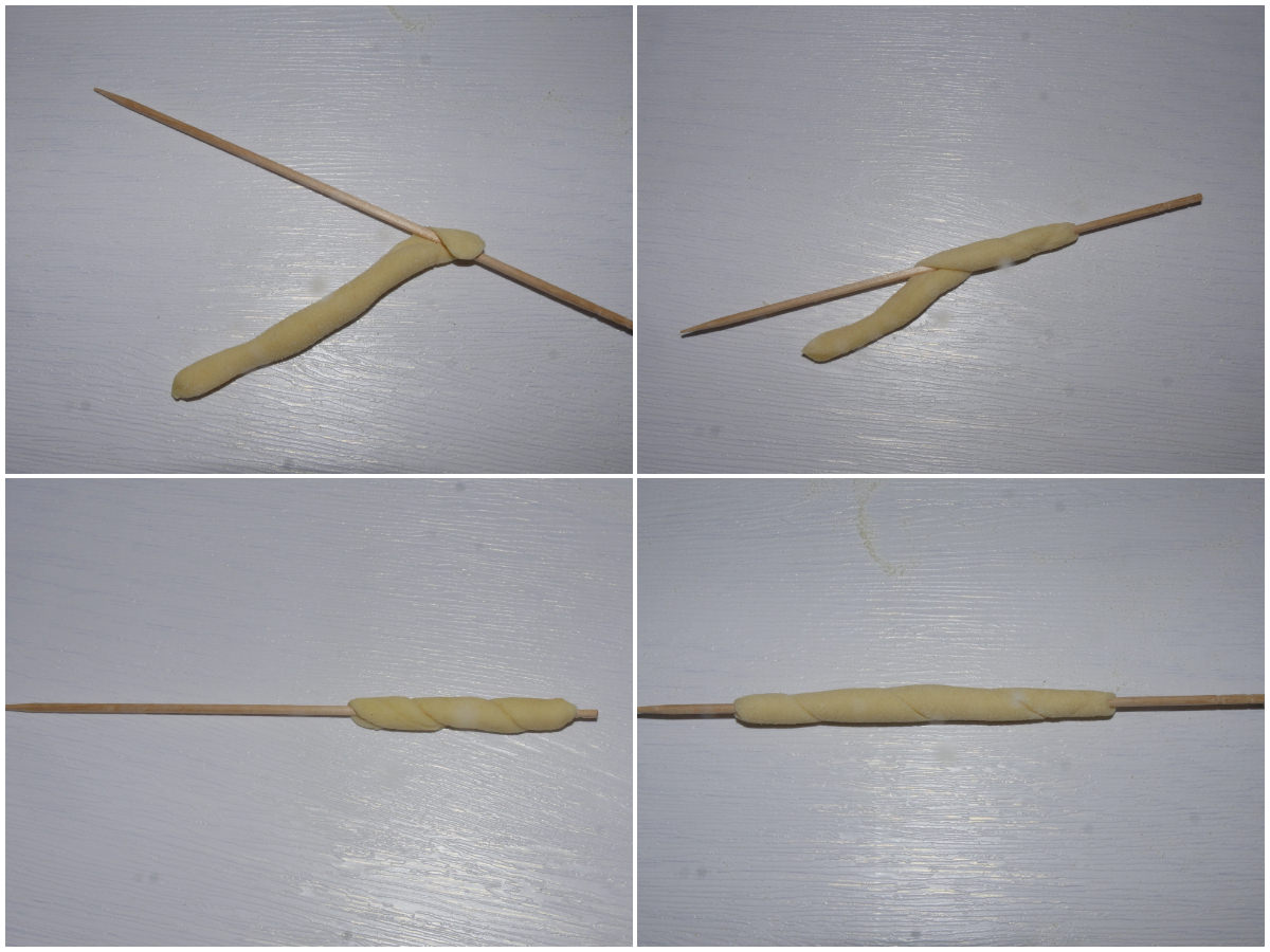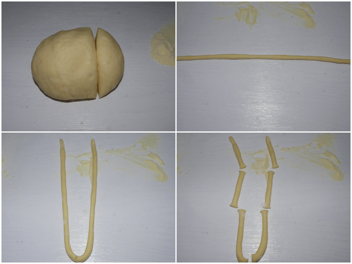 Prenez la pâte, retirez quelques petits morceaux et formez des cordons fins (entre 0,5 et 1 cm), puis coupez-les sur une longueur de 7-8 cm (si vous le souhaitez vous pouvez les allonger encore, mais ils seront plus difficiles à travailler ).