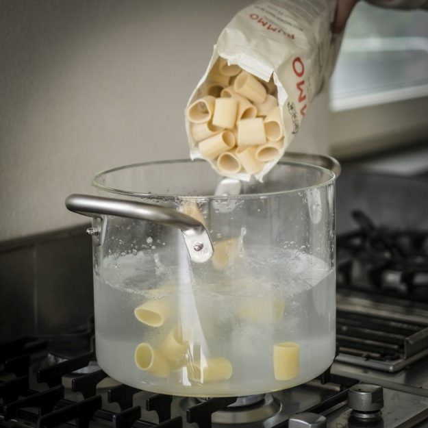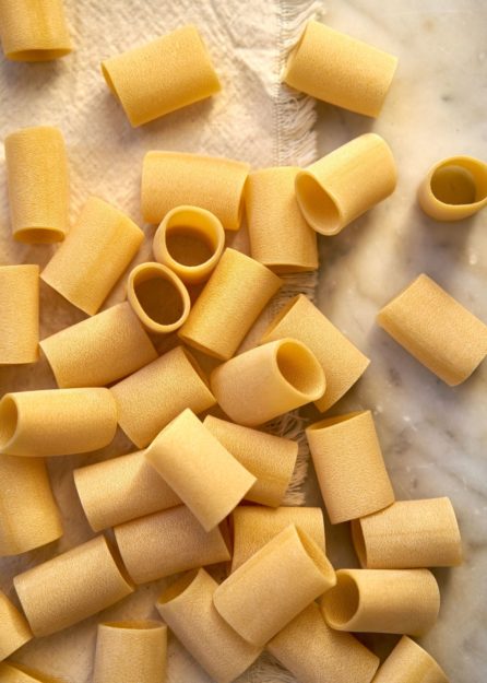 Faites cuire les paccheri dans l’eau bouillante, puis remuez-les dans la sauce, unen ajoutant une touche de fraîcheur grâce à un filet d’huile d’olive extra vierge versée crue et une pincée de persil haché et d’écorces râpées des citrons parfumés de la côte amalfitaine.
