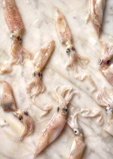 Nettoyez les calamars en coupant la tête en deux dans le sens de la longueur afin qu’ils s’enroulent pendant la cuisson (évitez plutôt les anneaux). Coupez ensuite en deux la touffe des tentacules sans le bec.