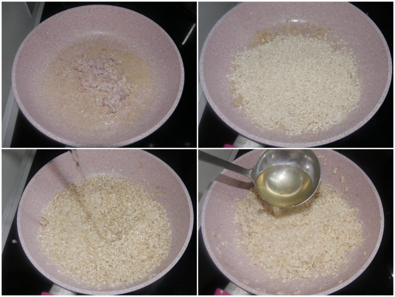 Ajoutez le riz et faites-le griller, mélangez avec le vin, puis lancez la cuisson en ajoutant le bouillon petit à petit.