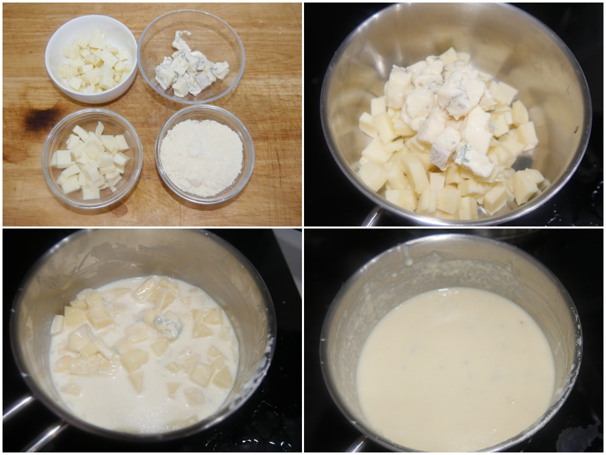 Pendant ce temps, coupez tous les fromages en morceaux, mettez-les dans une casserole avec la crème et faites-les fondre Ă feu moyen-doux jusqu’Ă l’obtention d’une fondue.
