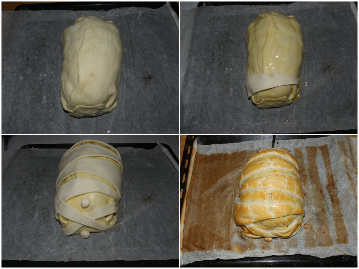 Disposer le rôti sur la plaque de cuisson tapissée de papier sulfurisé, badigeonner la pâte d’œuf battu, puis utiliser le deuxième rouleau pour créer les décors.
