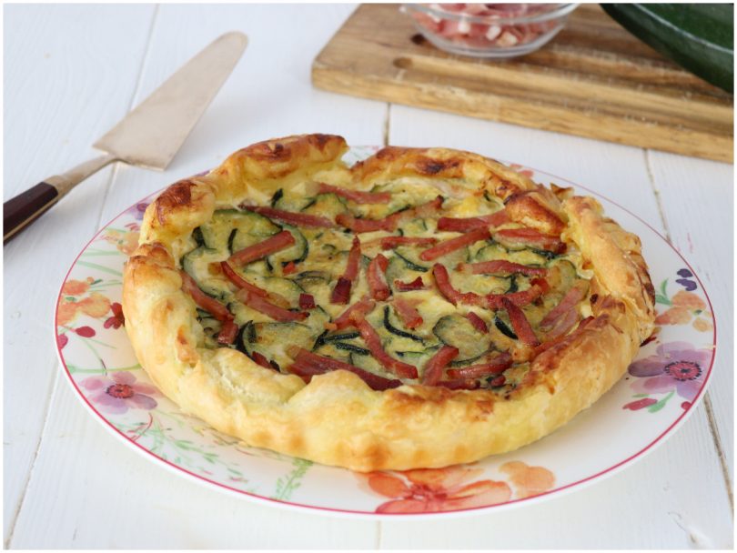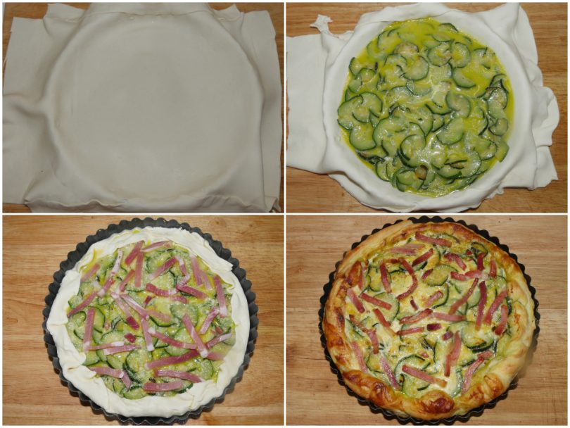 Tapisser le moule beurré avec la pâte feuilletée (j’avais le rectangulaire et j’ai dû couper les bords, si vous utilisez le rond il n’y aura pas besoin), remplissez-le avec la garniture de courgettes et ajoutez le speck.