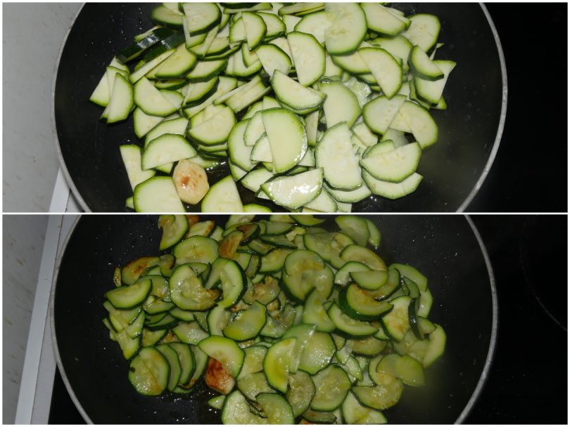 Faites chauffer un peu d’huile avec l’ail dans une poêle anti-adhésive, ajoutez les courgettes, salez et laissez mijoter à couvert pendant 10 minutes en remuant de temps en temps, puis retirez le couvercle et laissez-les dorer et sécher.